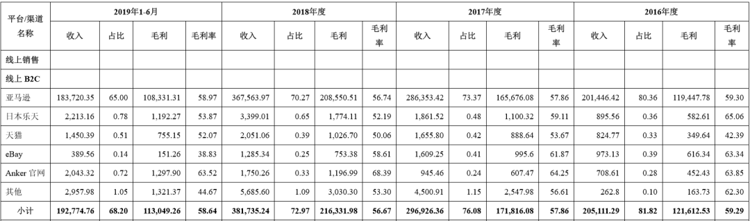 根据官方资料,安克创新的境内外渠道体系包括线上电商渠道、线下销售渠道等。其中,线上B2C渠道是最早发展和销售占比较大的渠道,其产品主要依托亚马逊、eBay、日本乐天等第三方电商平台覆盖海外消费者。2017年至2019年,公司在亚马逊平台上的销售收入为28.6亿元、36.8亿元和44.1亿元,占线上B2C模式收入比重为96.44%、96.29%和95.16%。