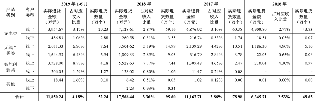 据悉,目前,安克创新旗下产品主要有三大类:以手机充电宝、充电线为代表的充电类;蓝牙耳机为主的无线音频类;扫地机器人为主的智能创新类。他们在2017年度、2018年度、2019年度占主营业务收入的比重分别为98.97%、99.74%和99.30%。其中,充电类产品是公司的主要产品类型,为收入及业绩的重要来源。
