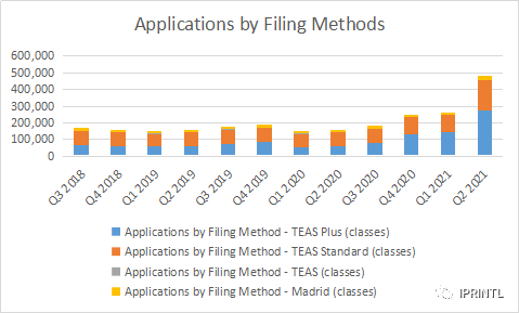 The number of trademark applications in the second quarter reached a new high. The total number of trademark applications in the Q2 2021 was 484,230 (counted by application classes), of which 271,488 were by TEAS Plus (selecting goods/service items from IDManual of USPTO), and 183,957 were by TEAS Standard (freely describing goods/service items) , and other 28,785 applications were from the Madrid Protocol. It increased significantly by all methods, compared with the Q1 2021.