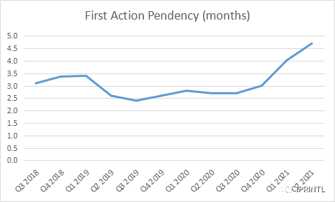 数据显示,第二季度,从申请人提交申请(含马德里指定美国)至USPTO下发FA需时4.7个月(约140天),这个数字为USPTO近三年来的历史极值,而其目标是2.5-4.5个月(约75-135天)。(在笔者年初的文章《美国专利商标局发布2020财年年报》中,USPTO还提到其初审时限目标是2.5-3.5个月。)