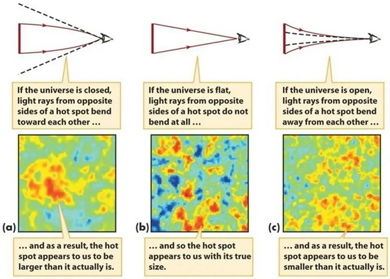 来自宇宙微波背景辐射的光在传播过程中会根据宇宙的曲率发生偏折,这些光到达观测者眼里,使得温度涨落的亮斑看起来和实际尺寸有所不同,这被称为引力透镜效应。如果宇宙的曲率为正(如下图左),亮斑看起来会比平坦宇宙中的更大一些;如果宇宙的曲率为负(下图右),则亮斑看起来会更小一些。根据这条线索,天文学家可以将实际观测到的亮斑大小与理论预测值对比,由此判断宇宙是不是平坦的。