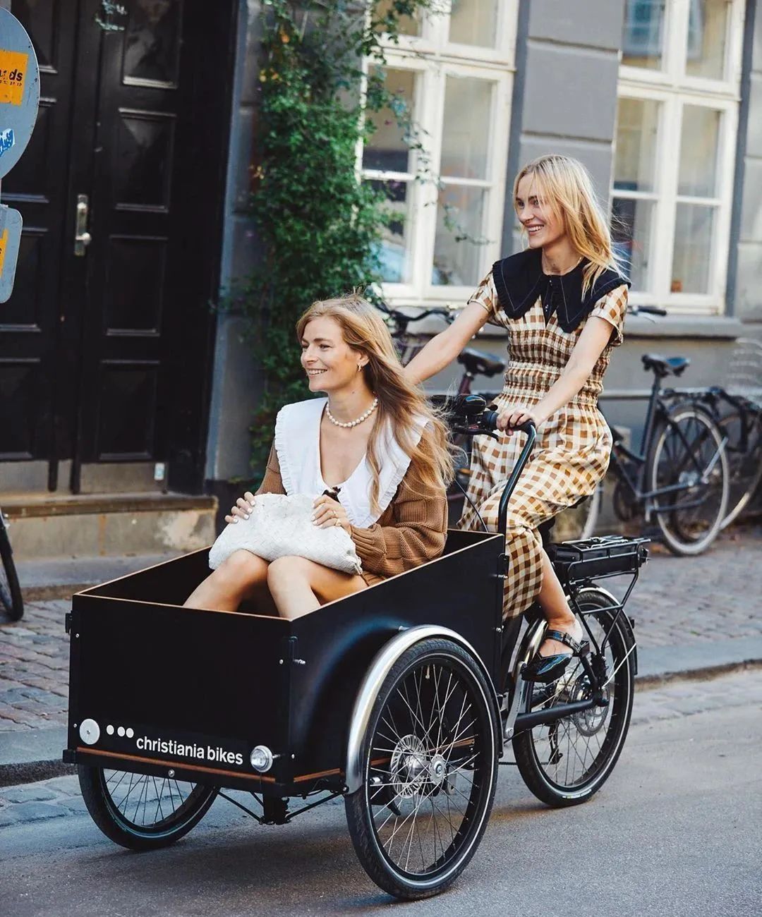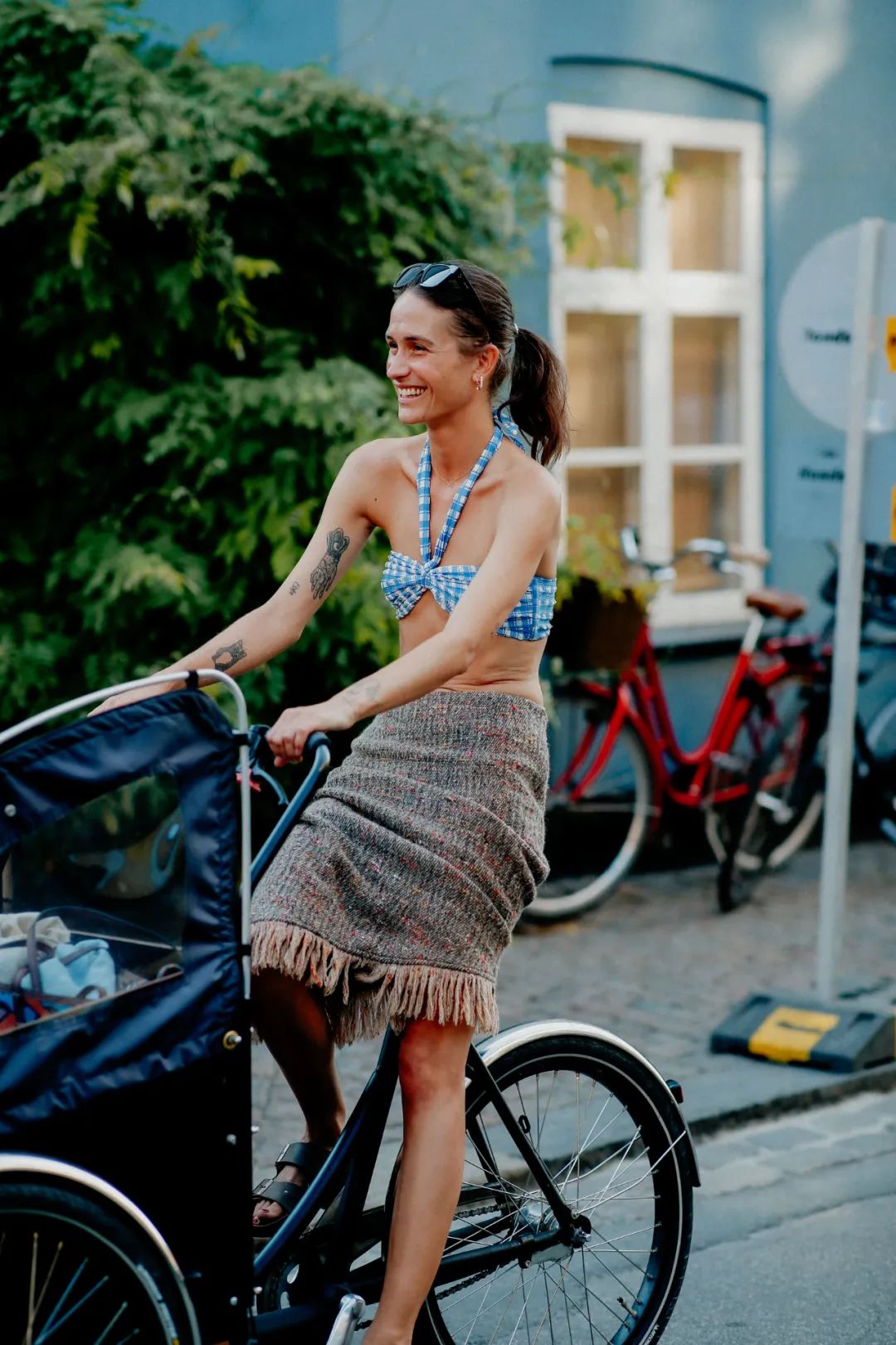 哥本哈根是骑在自行车上的城市,在街拍场中惬意悠闲的哥本哈根人不是在骑车就是在推车,正因为这种环保、健康的生活方式,赋予了哥本哈根风格随性自在、环保的时尚调性。