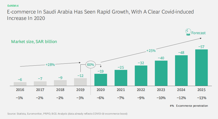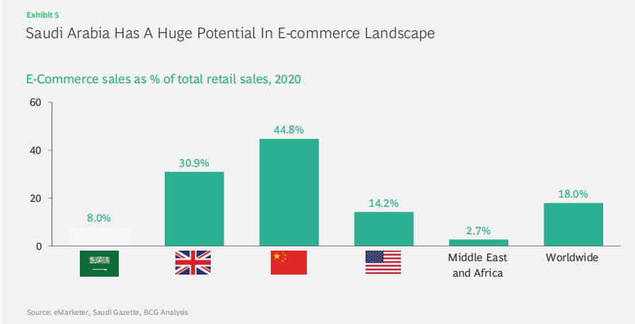 2020 年,沙特阿拉伯的线上销售额约占零售总额的 8.0%,而全球为 18%,这一数字也远低于渗透率轻松超过 30% 或 40% 的领先电子商务市场。