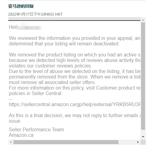 他们回复的内容是:我们已审核您在申诉中提供的信息,并确定您的商品将保持停售状态。由于检测到大量违反亚马逊买家评论政策的滥用活动,我们移除了您拥有在售卖家报价的相关商品信息。