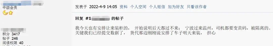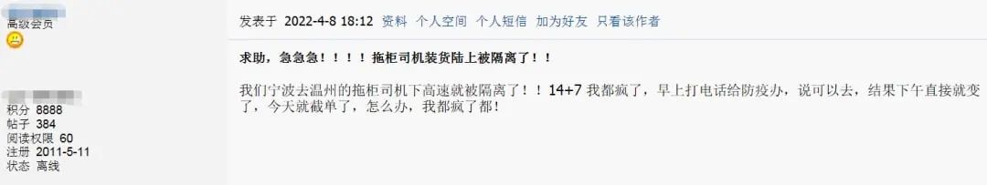 4月8日,有货代在论坛上反映称:"我们宁波去温州的拖柜司机下高速就被隔离了!!14+7 我都疯了,早上打电话给防疫办,说可以去,结果下午直接就变了,今天就截单了,怎么办,我都疯了都!"