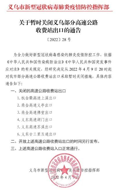 4月9日晚,义乌发布紧急通告:从2022年4月9日20时起,对部分高速公路收费站出口采取暂时关闭措施。