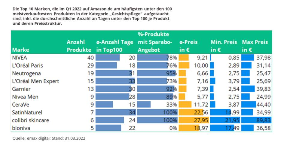 在2022年第一季度,共有来自110个品牌的301款产品出现在亚马逊德国站(Amazon.de)的"面部护理"类别中。入选"面部护理 "类别畅销榜前100名的涉及妮维雅、欧莱雅等多个品牌。