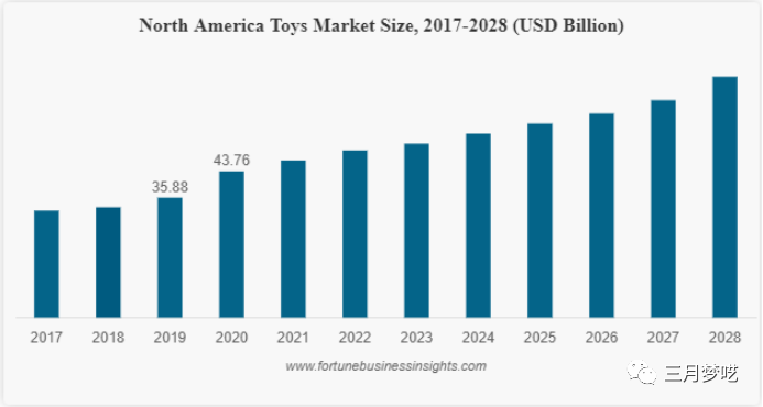 我们拿美国来举例,在2019-2021年的调查中发现,全美80%%的家庭都有节日给孩子买玩具的习惯。2020年全球的玩具市场的规模为1294.5亿美元,由于新冠疫情的影响,玩具的需求有所增加,2020年当年就实现了22.30%的增长,预计到2028年将增长到2306.4亿美元。