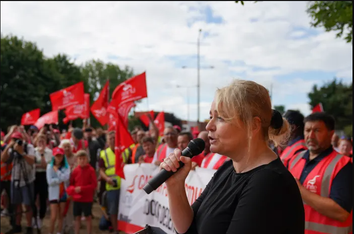 昨日PA Media报道称,联合工会秘书长莎朗向参与罢工行动的工人发表讲话,这些罢工工人聚集在萨福克费利克斯托港一号码头附近的一个环形交叉路口。