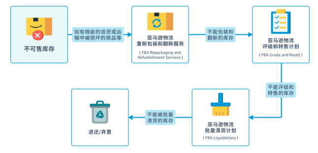 当您勾选了"翻新"、"评级和转售"和"清货"这些价值回收选项后,您的不可售库存将按照回收价值从大到小的顺序进行流转。如果库存不符合使用价值回收选项要求,亚马逊会再根据卖家设置的选项,将其退还和弃置。