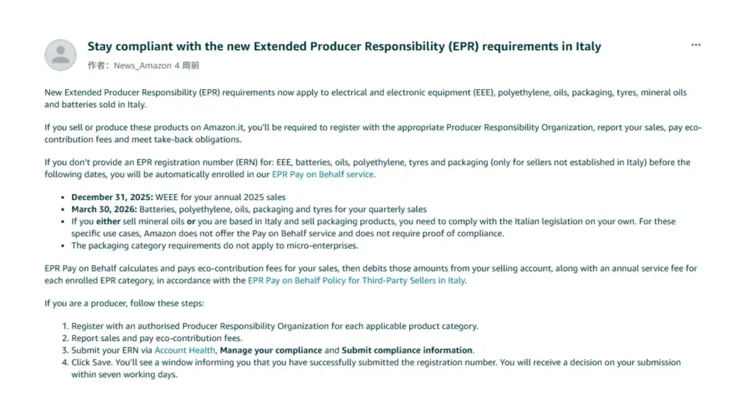 2025年12月31日前,销售WEEE产品的境外卖家必须提交意大利WEEE注册号,逾期未办则亚马逊自动启动"代扣代缴"服务。