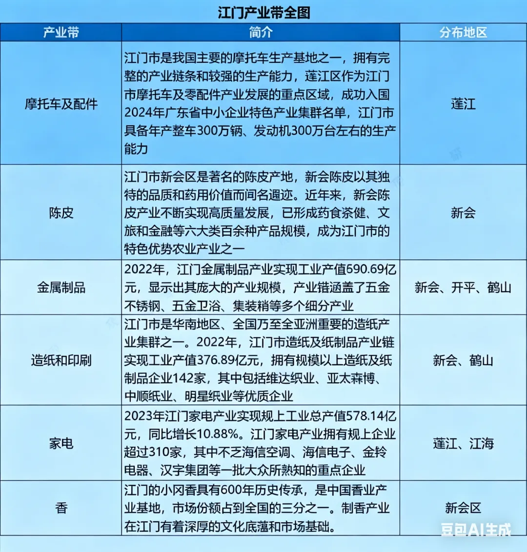 制表:跨境电商头条;来源:资料整理蓬江区:摩托车、智能家电双轮驱动作为江门中心城区,蓬江是江门产业带出海的核心引擎,形成了摩托车及零配件、智能家电两大王牌产业;蓬江集聚了江门最核心的摩托车整车与零配件企业,具备年产整车300万辆、发动机300万台的生产能力,形成了从研发、生产到检测、出口的全链条闭环。