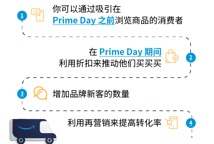 在Prime Day期间,你可以通过促销、优化过的品牌旗舰店页面、搜索广告和展示广告以及再营销等各种推广策略,将了解你的品牌、在准备阶段观看过你的广告并且/或者浏览过你的商品详情页的消费者转化。