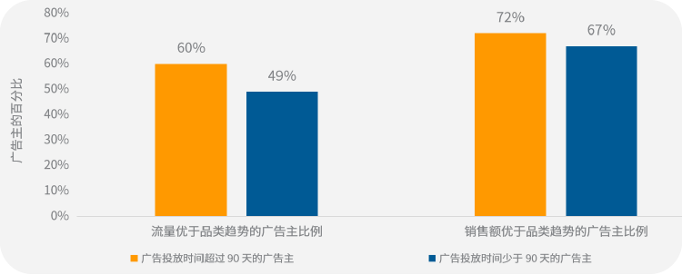 一个针对266名广告主的研究表明,广告投放时间超过90天的广告主,无论是流量还是销售额,都优于广告投放时间少于90天的广告主![3]