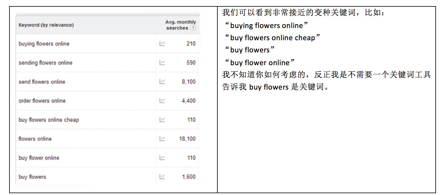 你也知道,google关键词规划师在你搜索"buy flowers online"的时候,并没有提供给你有价值的关键词。