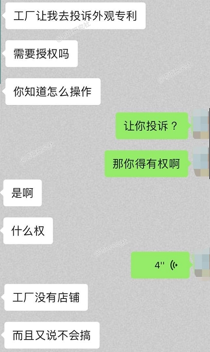 该卖家称,当下工厂没有店铺,工厂让其投诉外观专利,但需不需要授权不清楚。