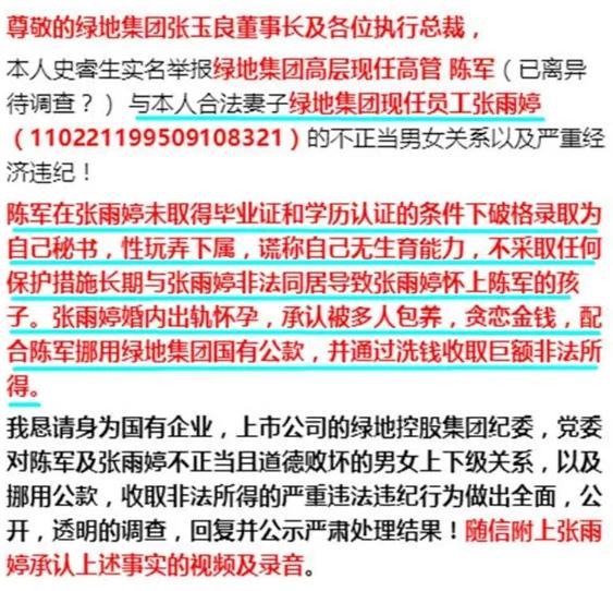 1、从2009年开始一直在澳洲学习、生活、工作的史睿生,在网上发布实名举报信,举报自己95年的老婆张雨婷,在仅工作了6个月的绿地集团,与其上司陈军发生了不正当男女关系。