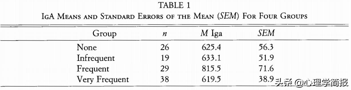 通过上述实验方法,Charnetski和Brennan教授对4组研究对象的IgA含量进行统计后得出了如下表所示的结果。