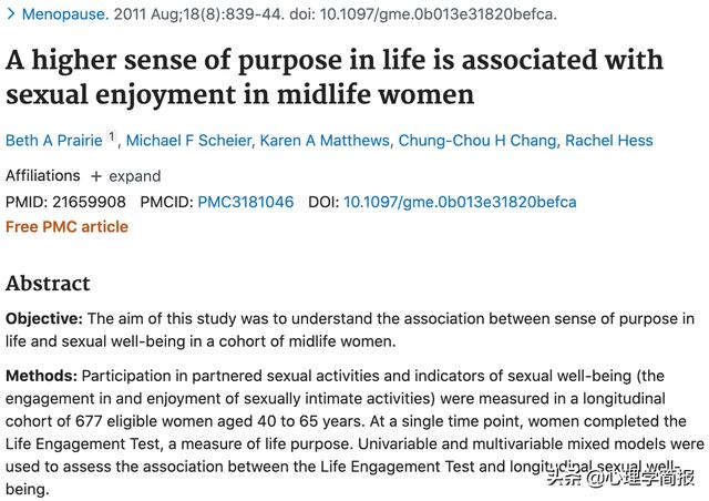 匹兹堡大学医学院(University of Pittsburgh School of Medicine)心理学研究人员Beth A. Prairie等人在2011年的研究中发现:对性满意度较高的中老年女性,对生活的目标感更高[3]。