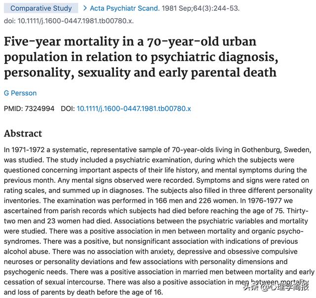 该项研究成果于1981年发表在期刊Acta Psychiatr. Scand,文献题目和摘要截图如上图所示。