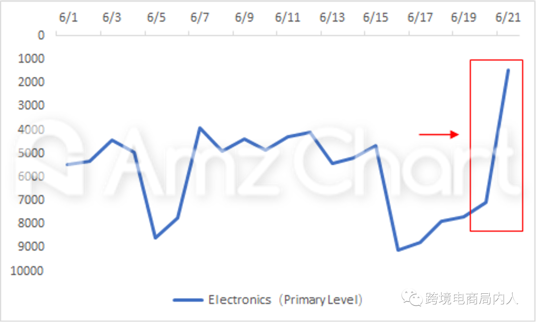 而6月21日当天该商品的大幅降价行为,倒是极大程度上拉升了其BSR排名,通过下图数据可以算出,6月21日当天该商品一级类目BSR排名就瞬间跃升近80%。