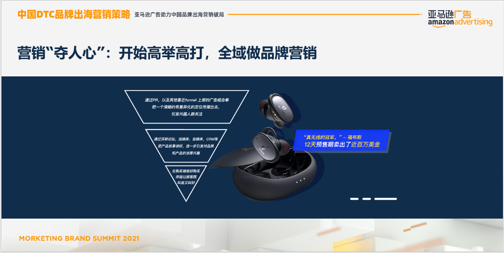 除了这些相对传统的方法之外,我们自己归纳的方法也取得了一些成绩,包括这个耳机上线的时候,价位在150美金左右,价格实际上是相对较高的。但是通过数字营销,以及亚马逊广告的加持,12天的预售就已经达到了差不多100万美金的销量。