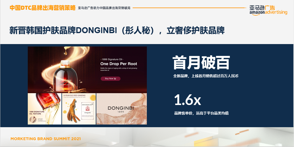 具体可以来看一个案例,我们代理的韩国一个品牌就是彤人秘,他的客单价很高。但是我们看到亚马逊这几年美妆品类发展的很快,市场份额增速非常快,所以当我们接到这个品牌的时候,就把这个品牌在亚马逊做了新的定位,同时结合我们当时的数据发现,韩国K beauty在美国是一个很流行的品牌代名词,同时亚马逊上又缺少韩国高端品牌的情况,我们就结合亚马逊的广告以及站外的一些导流,最后一上线的时候我们就取得了比较好的成绩。