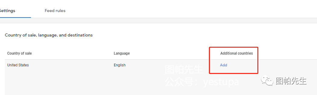 2. 进入你所选择的feed的设置,点击 "添加Add",然后选择你的国家和语言。