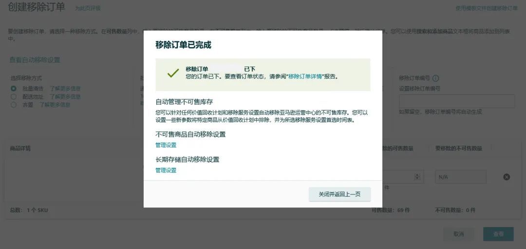 在"创建移除订单"页面中的"选择移除方式"模块下,选择"批量清货",并填写要清货的商品数量(【可售数量】或【不可售数量】),然后点击"查看",进入到订单检查页面。