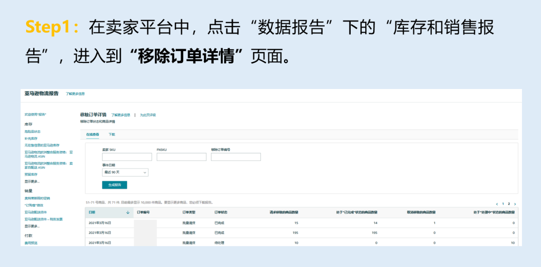 前往卖家平台,访问"库存规划"页面,可以在 "管理冗余库存"页面、"亚马逊物流库龄"页面、"修复无在售信息的亚马逊库存"页面等选择一个或多个需要移除库存的ASIN,对选定的商品"创建移除订单"。或者也可以下载"建议移除报告",查看亚马逊建议移除的商品。