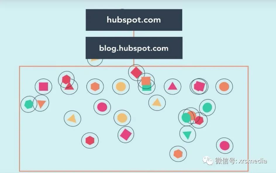 以往的网站架构可能是官网-> 部落格-> 文章,SEO 策略就是利用一篇篇的文章去追着不同主题的重点关键字与长尾关键字跑,试图抓住消费者的搜寻趋势和流量,而到最后部落格的内容就像上图的小色块一般变得重复性高又凌乱,彼此连结又错综复杂,导致演算法不容易去判别文章与文章间的相关性, Topic Clusters 可以怎么解决这个问题呢?马上来看看关于它的介绍。