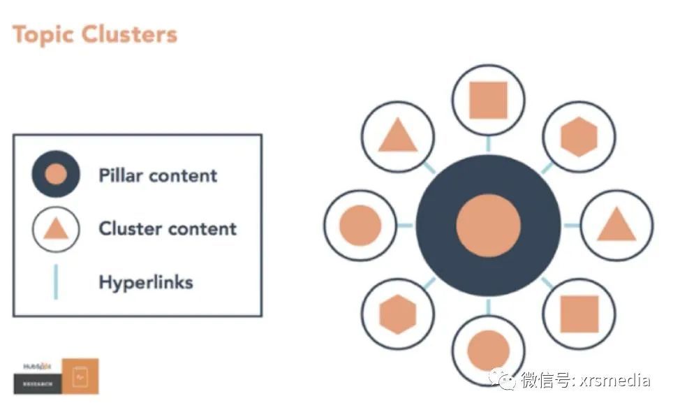 如上图所示,一个主题式群组架构会包含三种元素,中心的圆圈是支柱内容(pillar content)或称支柱页面(pillar pages)。它会是一个会广泛涵盖与某主题相关内容的页面,可以把它假想为某一个主题的摘要,从它延伸出群集内容(cluster content),也就是那些较细节、深入并锁定长尾搜寻的文章们。支柱内容/页面会有超链接(Hyperlinks)至群集内容,而群集内容也会有超链接回到它们。