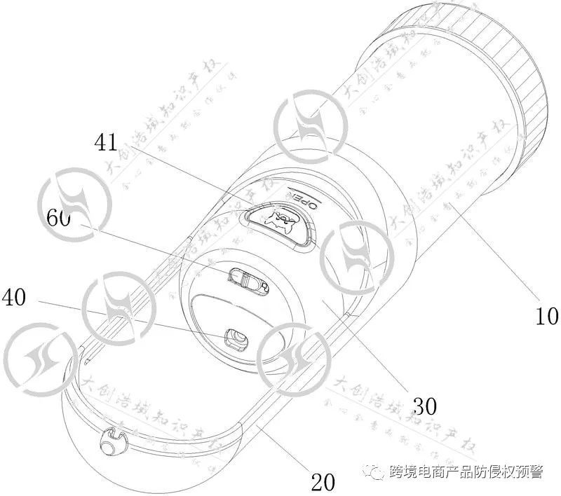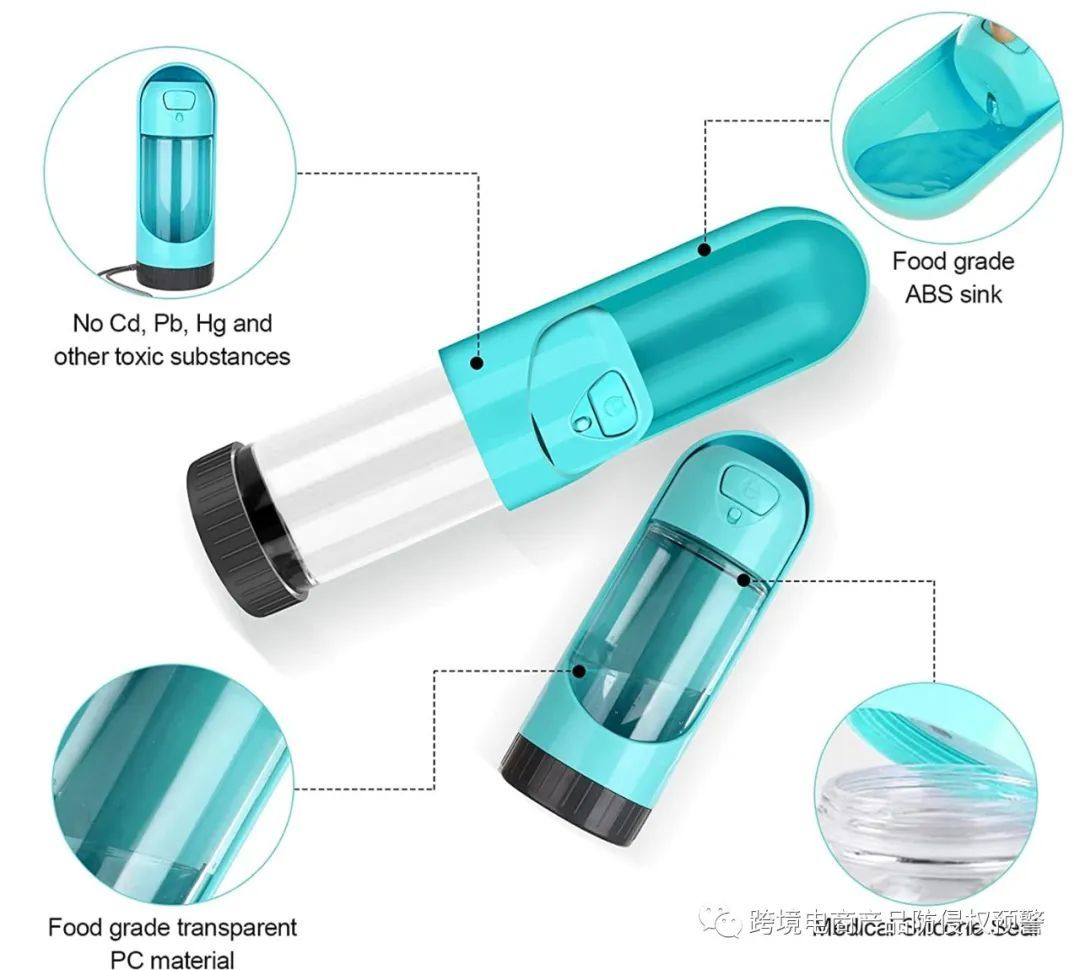 【宠物饮水瓶】,我看到在亚马逊美国站售卖得很不错,也发觉,有国内厂家正要准备做这款产品。我挑了其中一个款式(构造相对其他款式比较复杂)对其做了在美国市场的专利背景检索:最后,查到一个相关性比较大的美国发明专利(目前为公开状态,未正式授权),见权利要求1:一种便携式宠物喂水器,其特征在于,包括杯身本体和饮水滑盖,所述饮水滑盖套设在所述杯身本体的外壁上并能沿所述杯身本体的外壁滑动,所述杯身本体上设置有