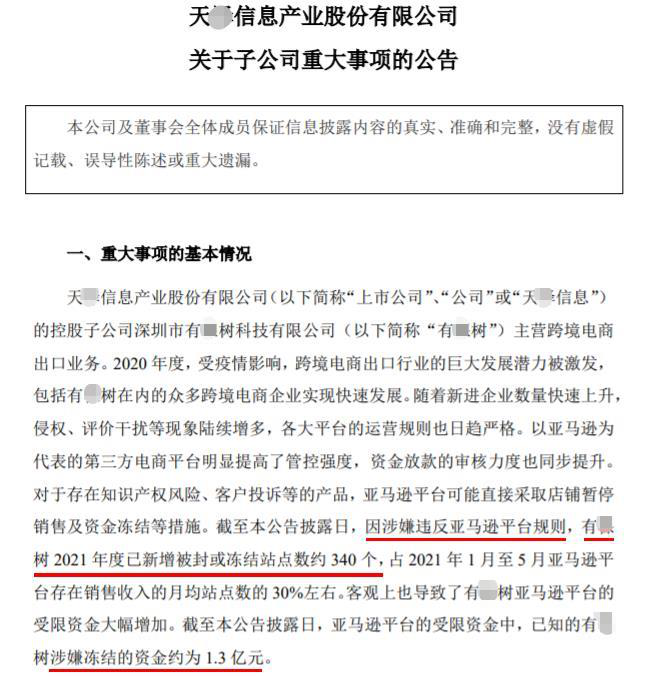 7月6日,业内赫赫有名的上市大卖天*信息发布子公司有*树重大事项的公告显示,2021年度新增被封或冻结站点数约340个,涉嫌冻结的资金约为1.3亿元。