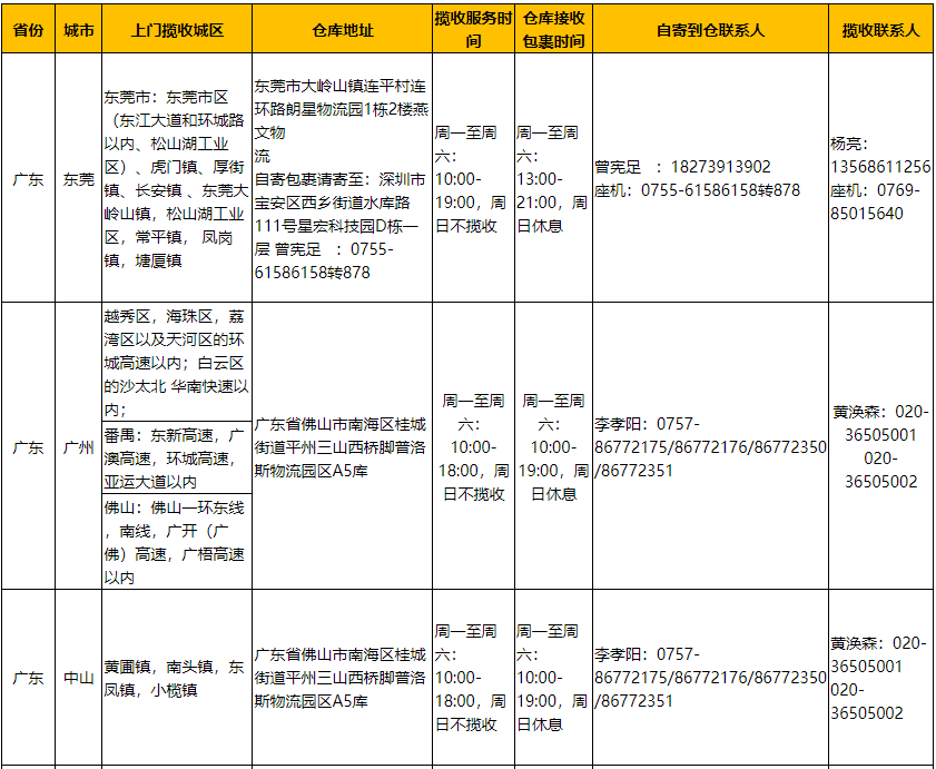 另外,为了商家更好的发货,本次额外增加 递四方惠州仓/递四方江门(实际由递四方中山仓负责揽收)对此次切换的5个物流服务产品进行揽收支持,这两个区域的商家可享受免费上门揽收服务。