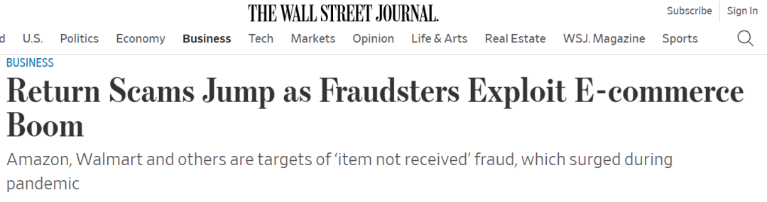 据华尔街日报7月13日报道,亚马逊平台退货欺诈行为急剧增加,消费者即使收到了货品,也声称从未收到过。文中提到,为电商提供防欺诈技术的公司Forter表示,一些卖家反映以"货品未收到"为由骗取退款的行为飙升了33%。
