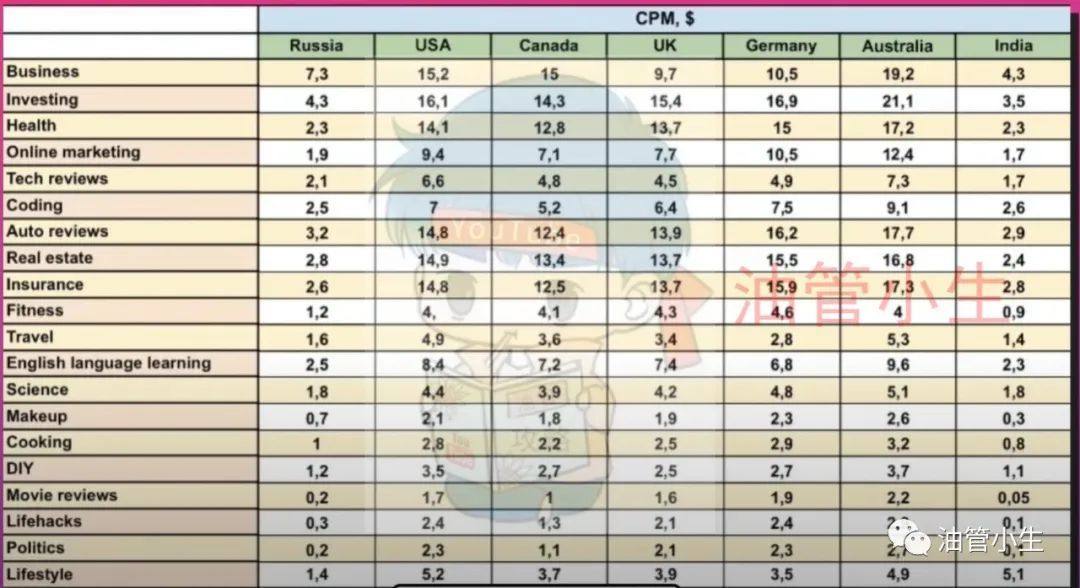 大家好,我是油管小生6月刚过,大家6月收益还满意吗今天小生给分享三张收藏关于CPM的图结合这三张图,基本可以回答大家最关注的问题了第一张【CPM和内容领域、国家的关系】下面这张是大家最常问的哪些领域CPM最高就不要再问老是问是不是财经最高这样的问题了商务、投资、健康排下来第二张【CPM和年经和内容领域的关系】以下是你的频道年龄层和CPM的关系总的来说消费能力高的CPM就高但依然有例外比如健康的内容