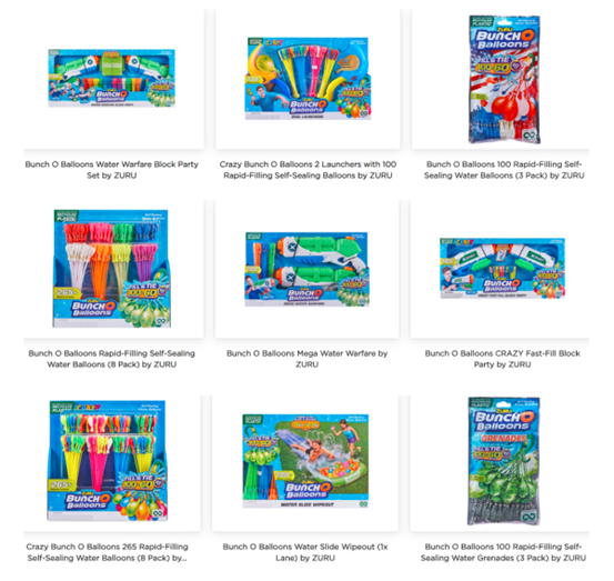 ZURU LLC.于2004年在新西兰创立,现总部设在香港。该公司致力于玩具设计、制造和营销,并且自主研发非标自动化设备、智能建筑开拓等业务。ZURU LLC.旗下有Bunch O Balloons、X-Shot、Rainbocorns、Robo Fish等品牌。本案起诉的是涉及Bunch O Balloons品牌的商标和版权侵权行为。品牌官网为:https://www.bunchoballoons.com/,以下是在其官网上部分产品截图: