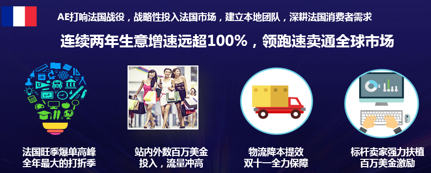 家居行业:单品销售活动期间破1000单,单次活动引入新买家600+;入驻速卖通三个月,法国快速成长为店铺主要驱动国家, 法国GMV占比店铺销量的30%+,一个月成长为法国标杆卖家!