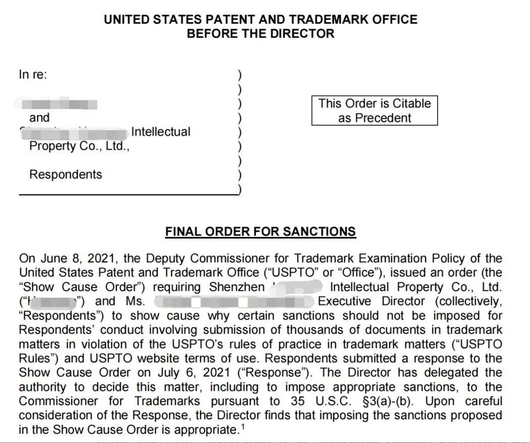 12月10日,美国专利商标局(即USPTO)发布制裁令,就此前向中国深圳一知识产权公司发出的"ORDER TO SHOW CAUSE"作出最终裁定,终审裁决撤销了该公司代理的超15000个商标,并永久关闭张女士及该公司的美国专利商标局账户,禁止创建或激活更多账户。 - 放弃申请或终止美国专利商标局的程序;