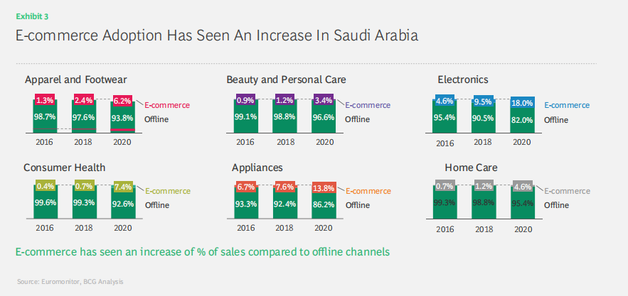 2020 年,沙特阿拉伯的线上销售额约占零售总额的 8.0%,而全球为 18%,这一数字也远低于渗透率轻松超过 30% 或 40% 的领先电子商务市场。