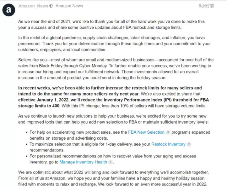 也就是说现在的IPI阈值下调只是个前菜,亚马逊后面还会继续放宽发货上面的限制,逐步将卖家的发货体验恢复到疫情前的水平。