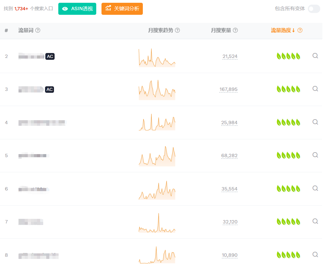 简单一点,就直接拿着竞品ASIN ,通过卖家精灵、Helium 10 、Jungle scout 等等工具会速度快一些,后台的品牌分析中的关键词搜索热度也可以。竞品流量词反查后会出现流量词、月搜索趋势、月搜索量、流量热度这些维度。我们需要做的就是根据月搜索量进行降序排列。