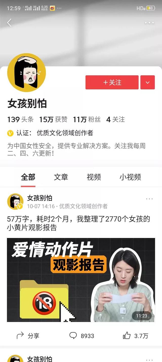 一名名为"@女孩别怕"的作者,调查了2700多名女性看小电影的调查。