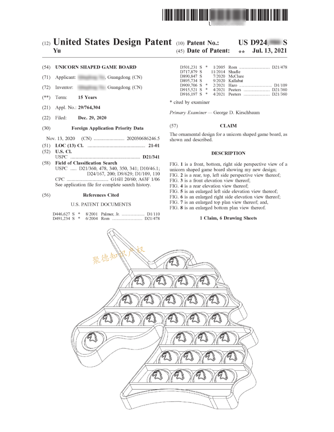 该专利于2020年12月29日提交,通过加急申请,2021年7月13日正式获取专利证书,保护的对象是具有独角兽轮廓的灭鼠先锋类益智玩具。