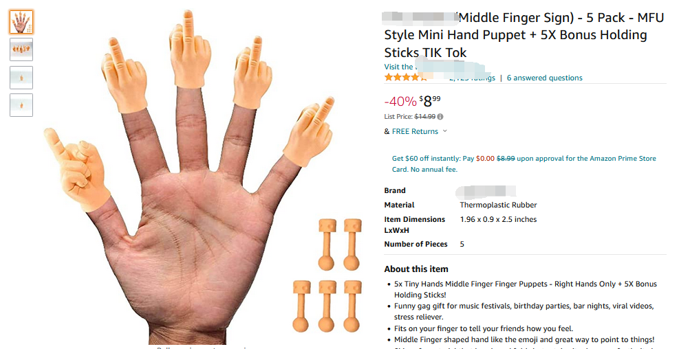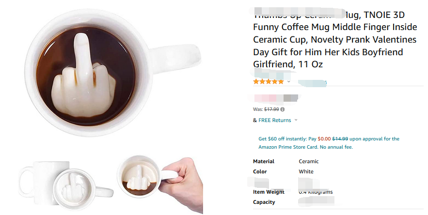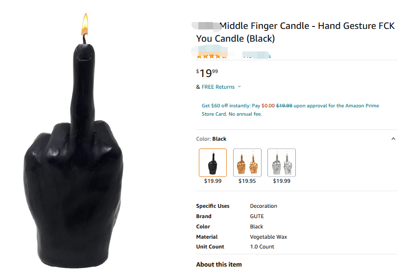 首先我们看到了是几款不太"文明"的产品,这些产品都有一个共同的特点,都是在围绕"竖中指"这个概念。"竖中指"这种行为方式在全球范围内都是一种常见的侮辱别人的方式,是一种很不礼貌的表现。但是在亚马逊上,以这个元素作为立意点的产品还真不少。