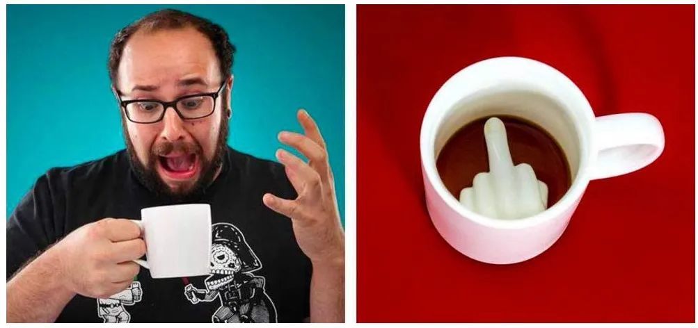 然后是这款看似正常的杯子产品,当你把杯子里的咖啡喝完的时候,杯子底部的"竖中指"动作就会浮现出来,让喝水的人"措手不及"。