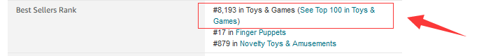 别小看这些小玩意非常不起眼,以上面这个中指套子来说,其在Toys&Games的大类目排名在8000多点,这个类目排名情况的非淡季日销量应该在35-45单左右。