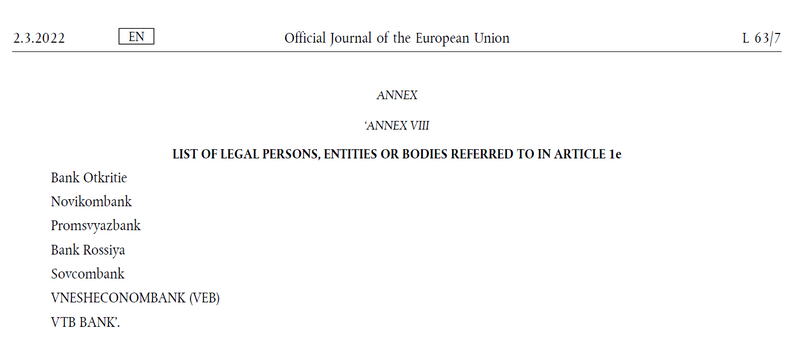 最新消息称,当地时间3月2日,据欧盟官方公报显示,决定将7家俄罗斯银行排除在SWIFT支付系统之外。