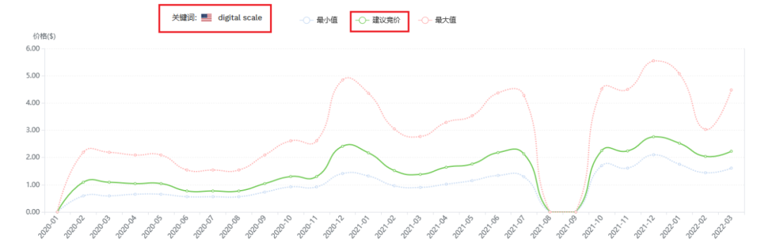 什么是农村包围城市?就是先从长尾词开始推,如果你是卖的scale,那么我不会从digital scale开始推,因为这个词的竞争程度太大,该关键词的建议竞价一般都在2美金徘徊,这个竞价跟产品售价相比,投资收益太低。